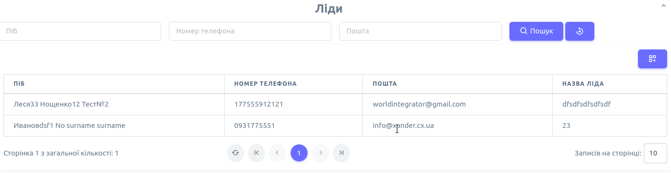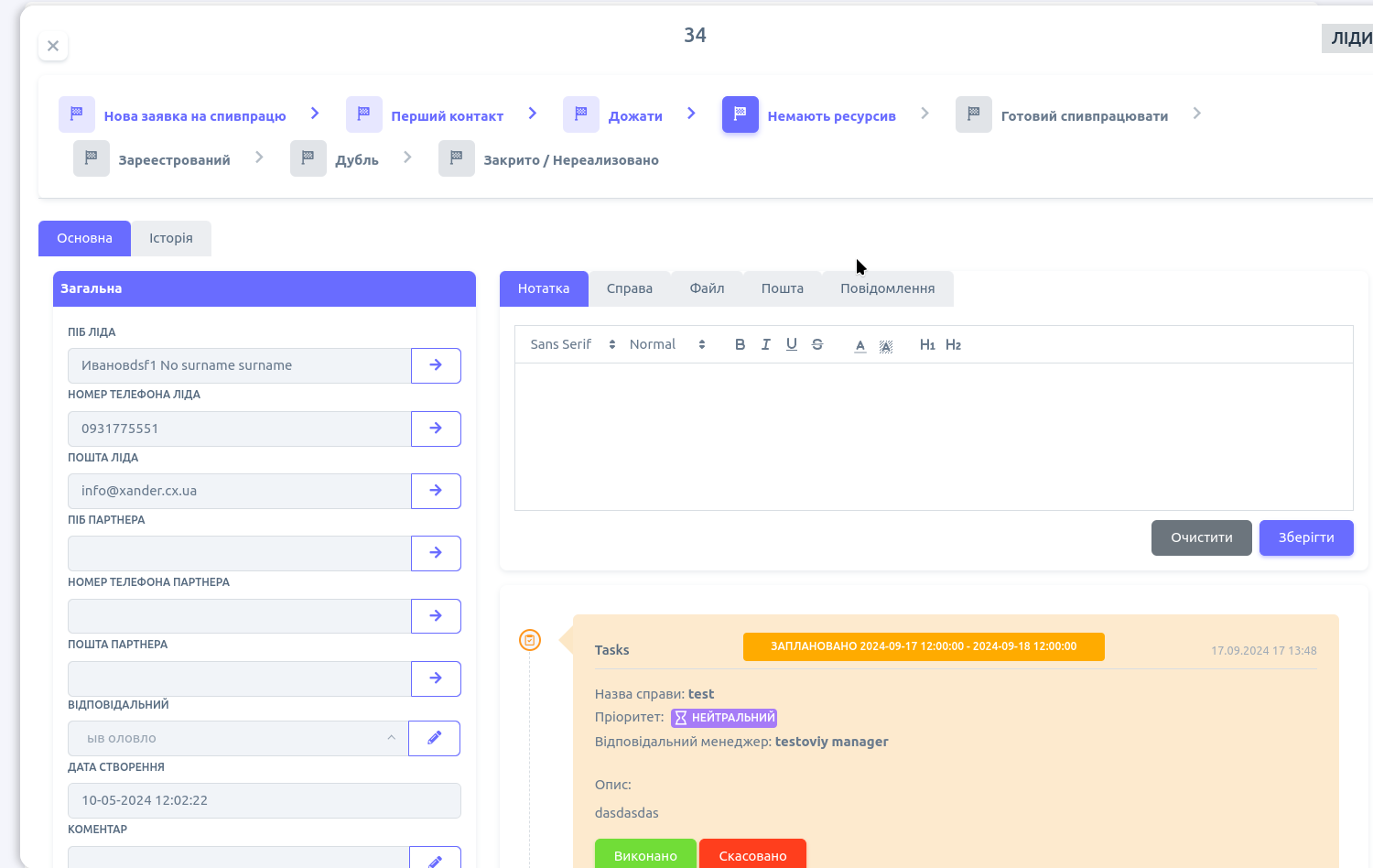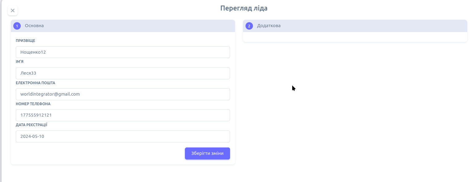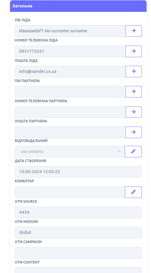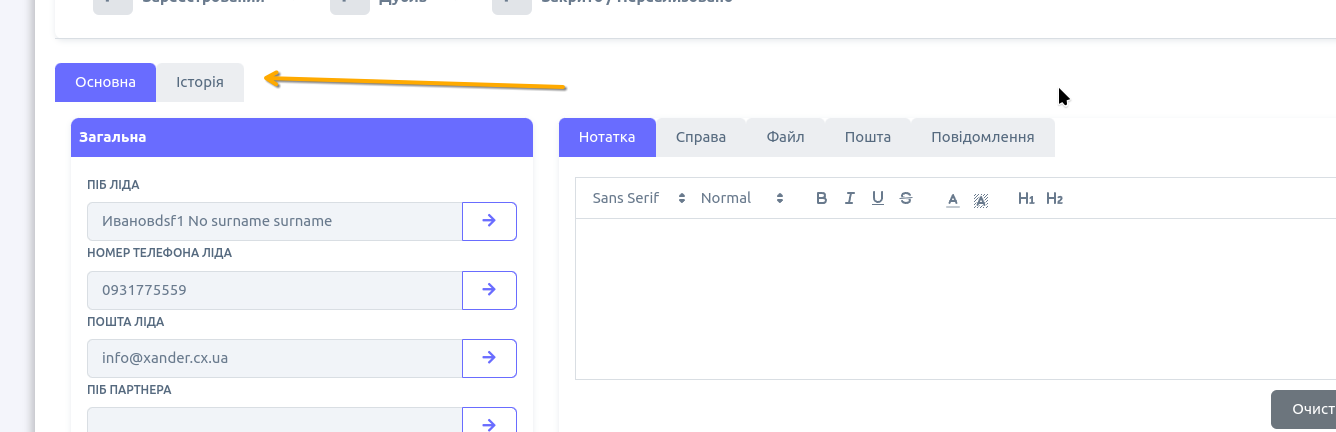 Таблица с Лидами: Двойной клик по лиду- Основна можно редактировать Контактные данные Лида