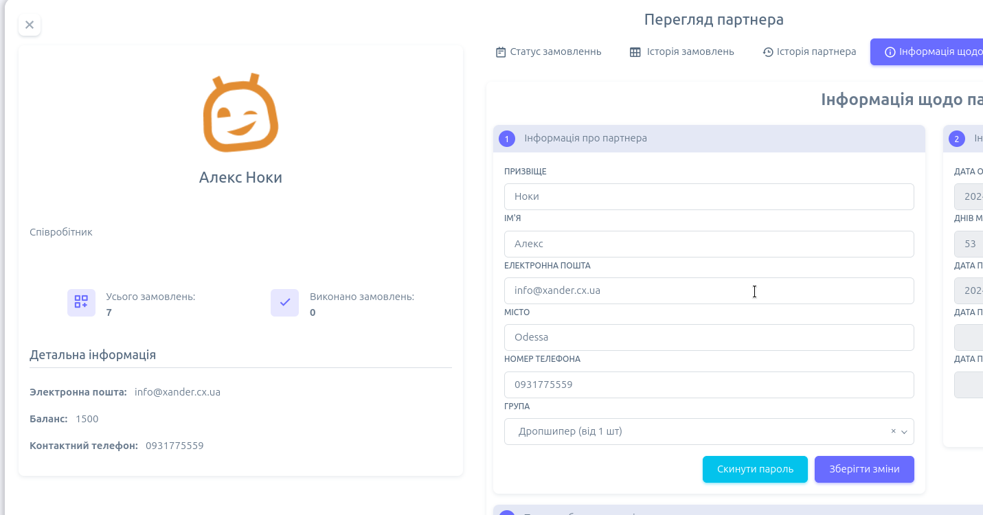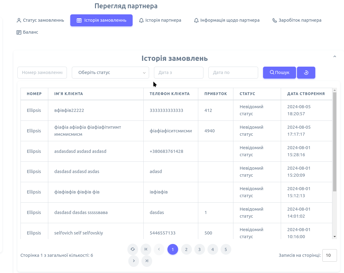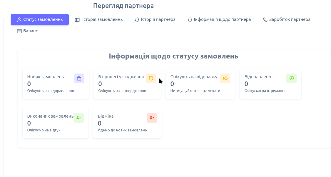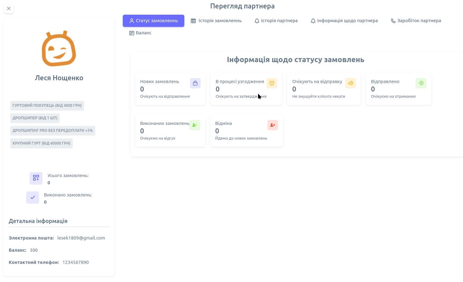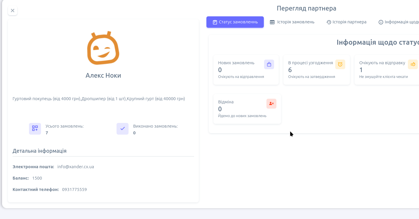 С возможностью найти по номеру заказа, отфильтровать по статусу, отфильтровать по дате создания. - История партнёра Ещё в разработке! Но планируется Выводить историю коммуникации с партнёром (Звонки, письма, СМС, создание карточки лидов)