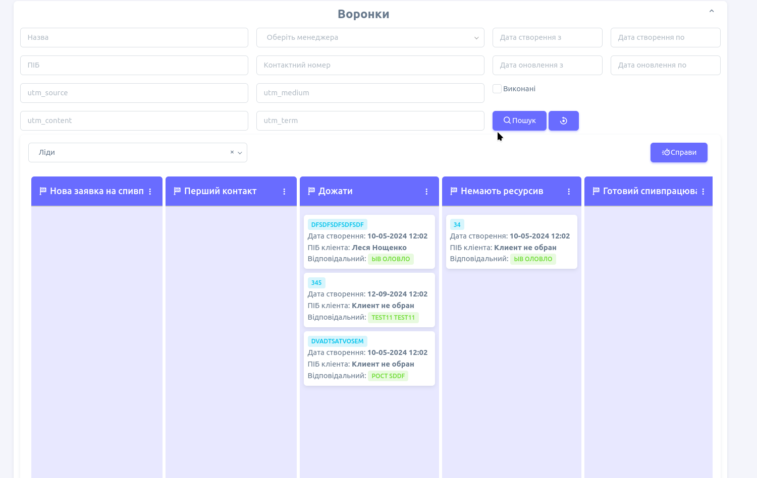 Есть поиск по названию, менеджеру, ФИО, телефону, меткам utm, Дата создания, Дата обновления