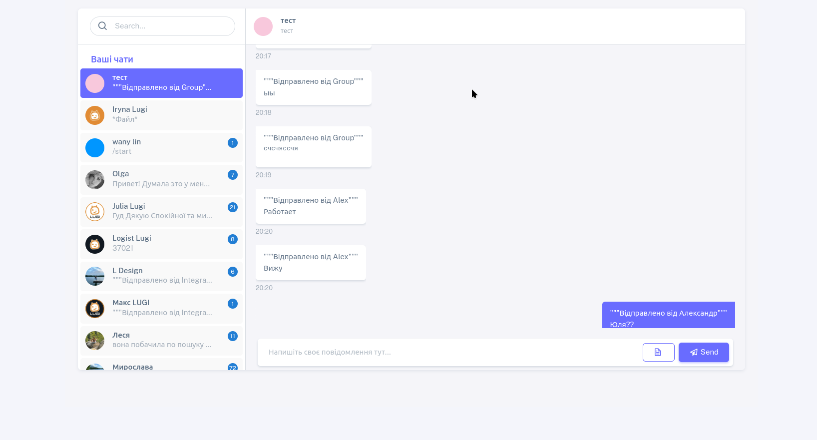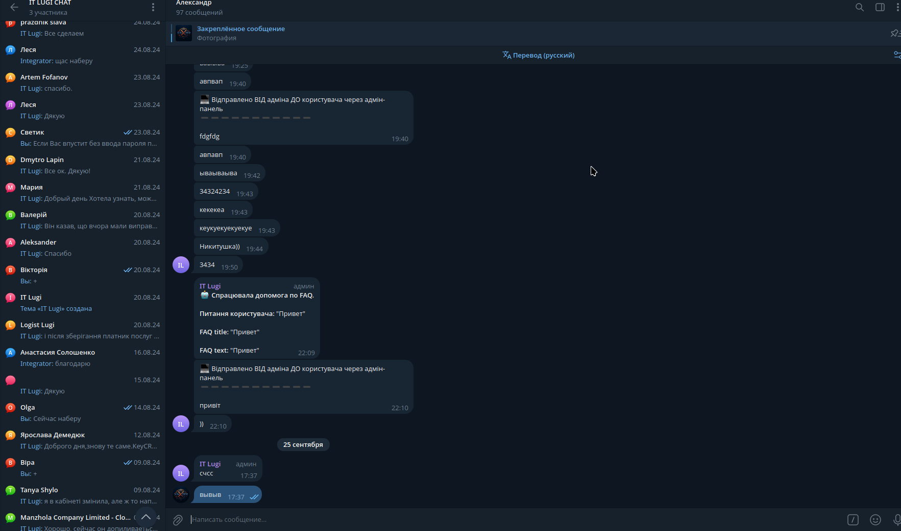 К переписке можно так же подключать Бата к группам. И переписка которая будет вестись в группе будет также попадать в кабинет или в ТГ