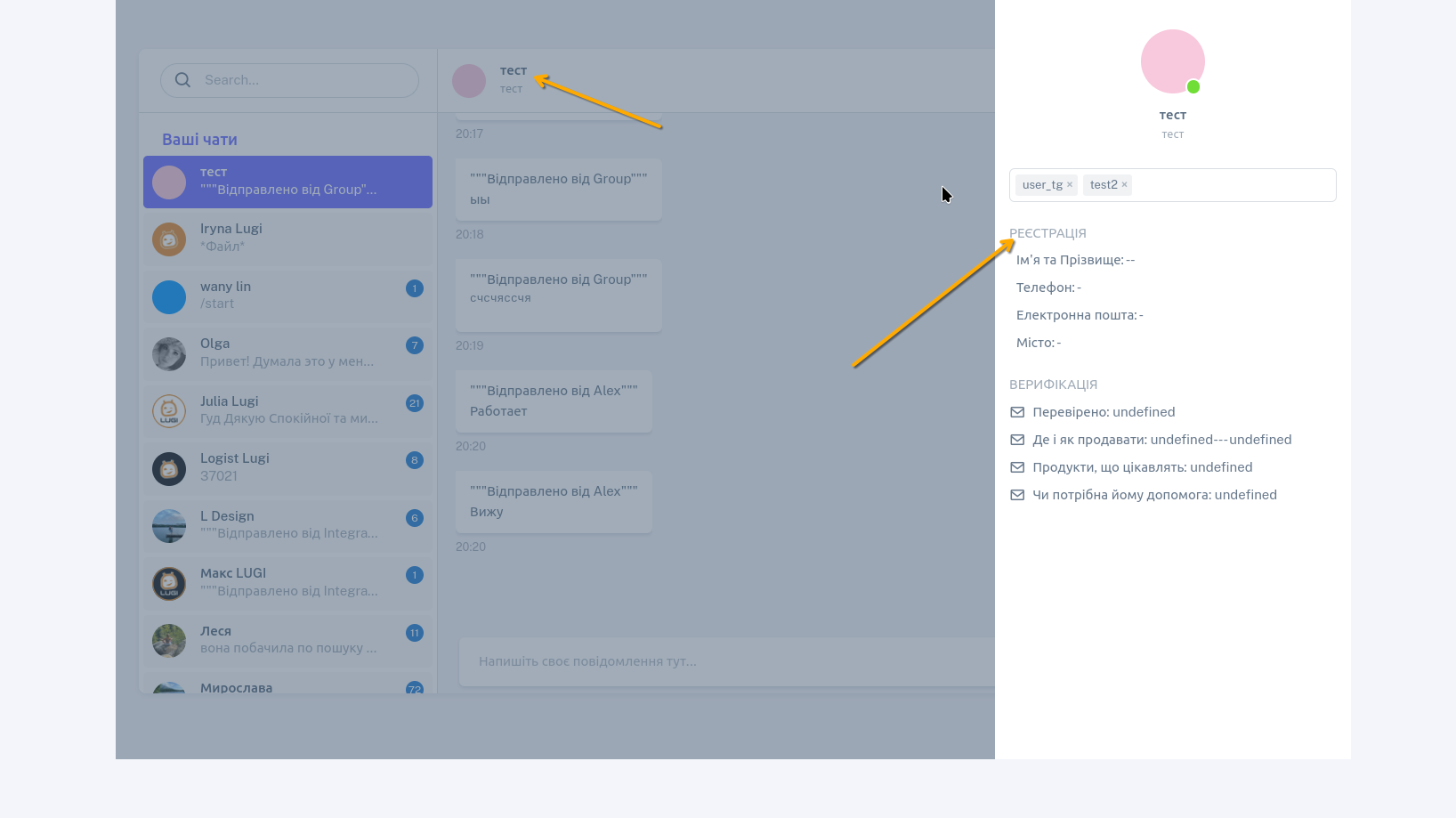 При нажатии на фото в чатах появиться окно контакта которой можно добавить Tags