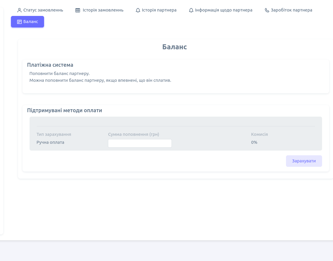 - Заработок партнёра. Ещё в разработке! Но планируется видеть там общие суммы заказов таблицу с расчётом за период фильтр по датам.