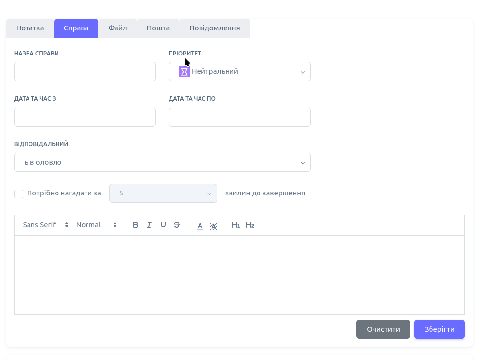 Кто должен выполнить задачу. Напоминание о выполнении задачи с выбором 5, 10, 15, 20 минут, Описание задачи - Файл