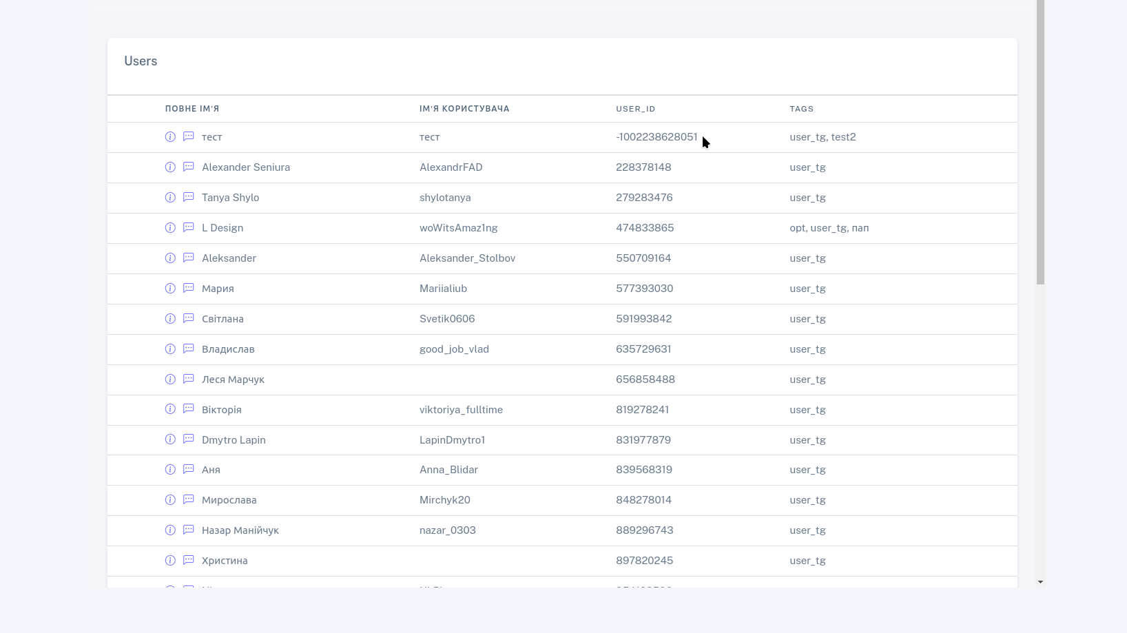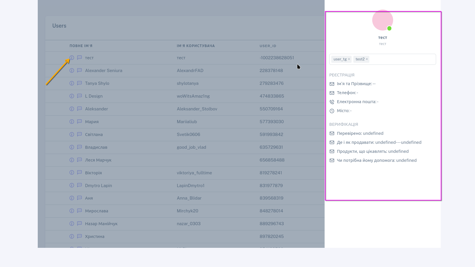 При нажатии на первый символ откроется карточка пользователя с выбором Tags