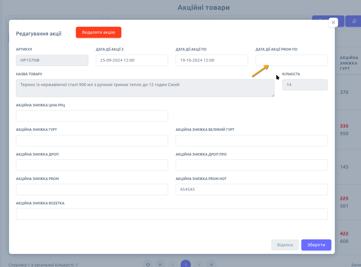 Появилось поле "Дата дії акції Prom по" Это поле только для акций для площадок пром)