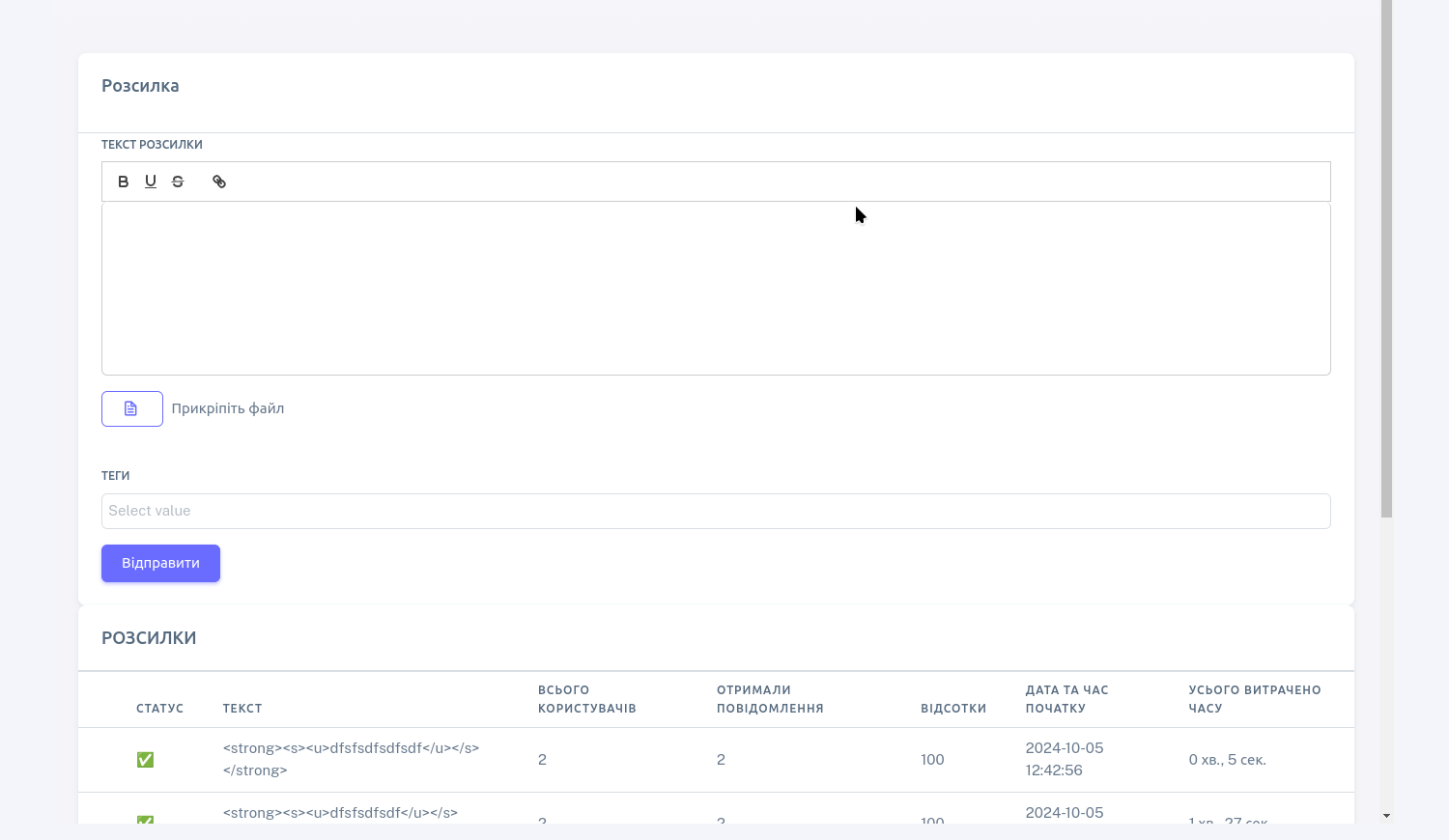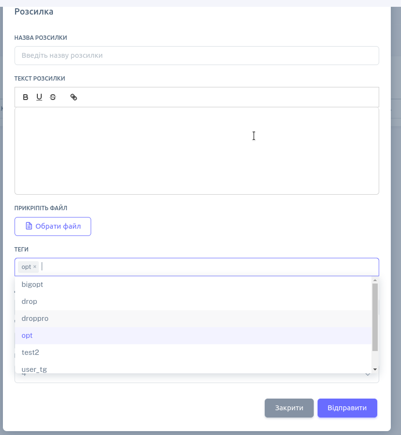 Пишем текст, оформляем его, можем прикрепить файл, Выбрать Tags каким пользователям будет идти рассылка.